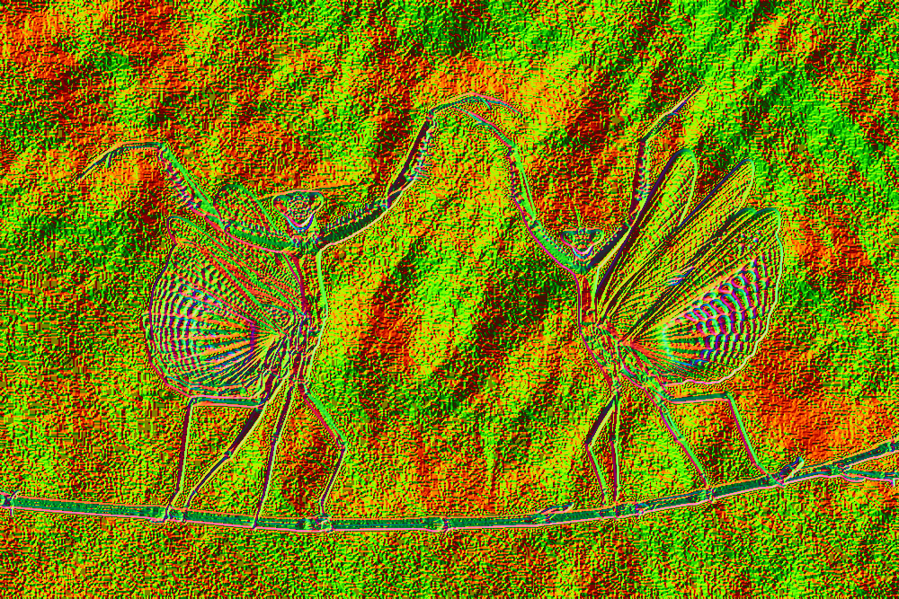 Auch im berühmten Foto der zwei Gottesanbeterinnen erkennt man lineare Fragmente, die auf eine Manipulation durch Fäden oder Drähte deuten: